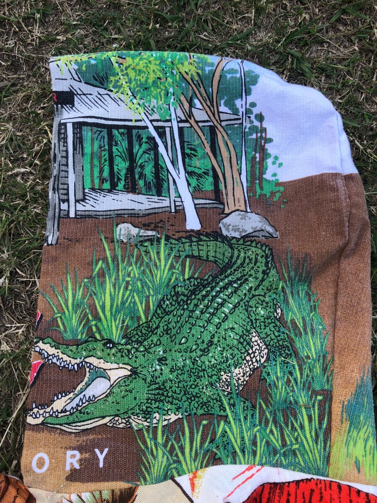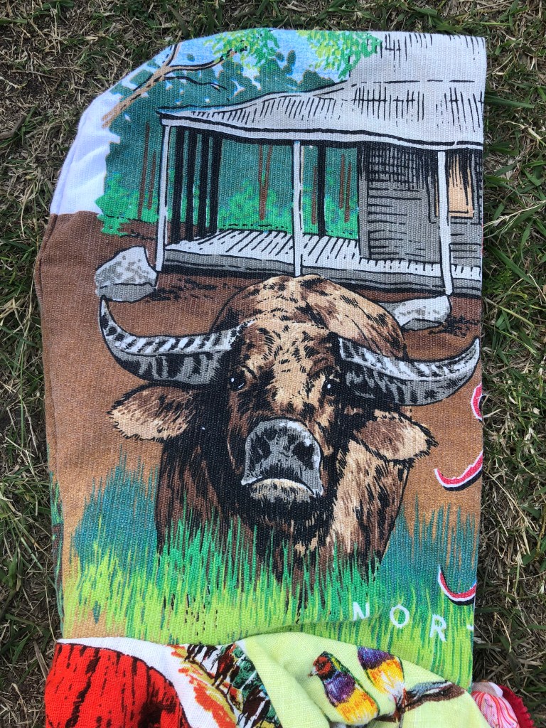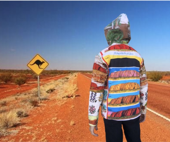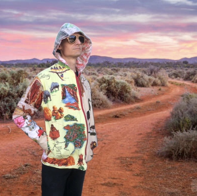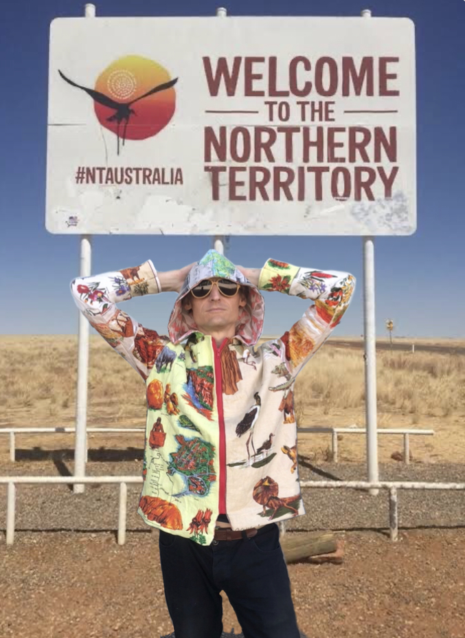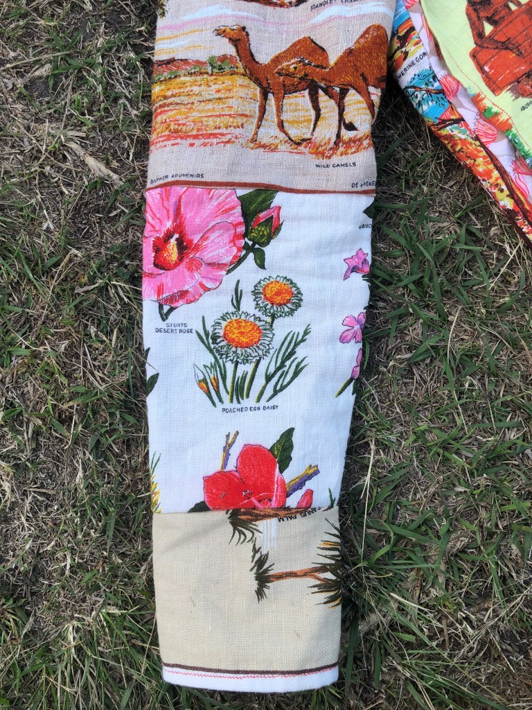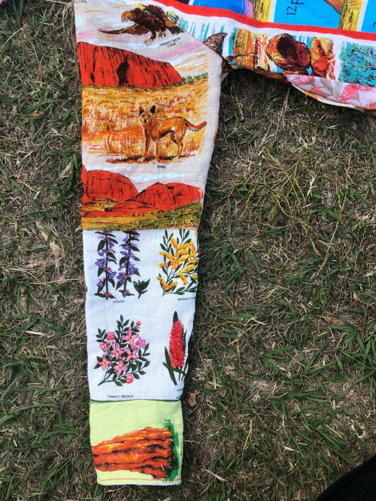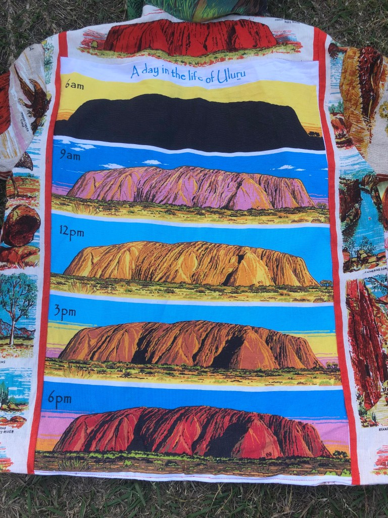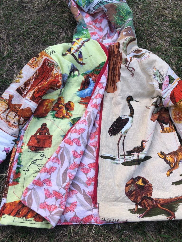 Red was the central theme for this one (no pun intended), so decided on using ochre coloured thread, a red zipper (for the red centre), with red blossoming gum nuts featured on the lining. Flora and fauna of the Northern Territory cover the jacket, with Uluru represented on the back in its different shades.