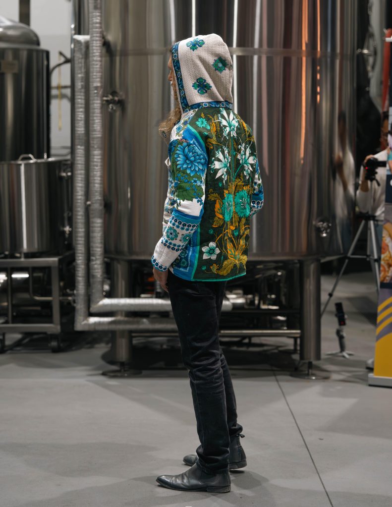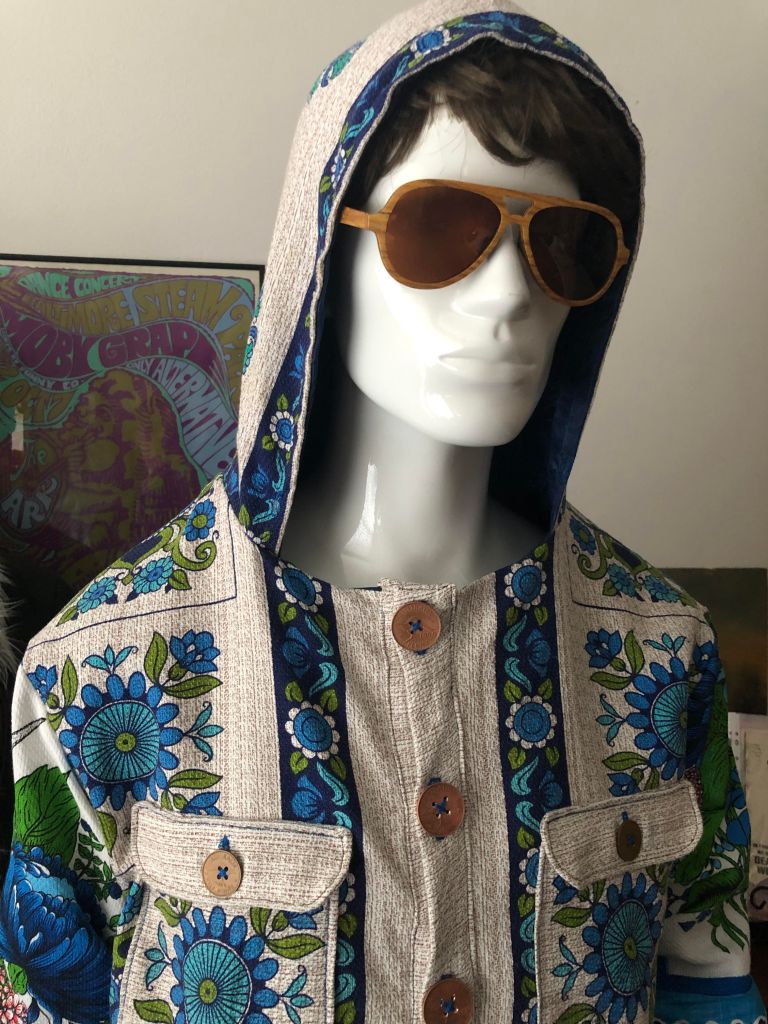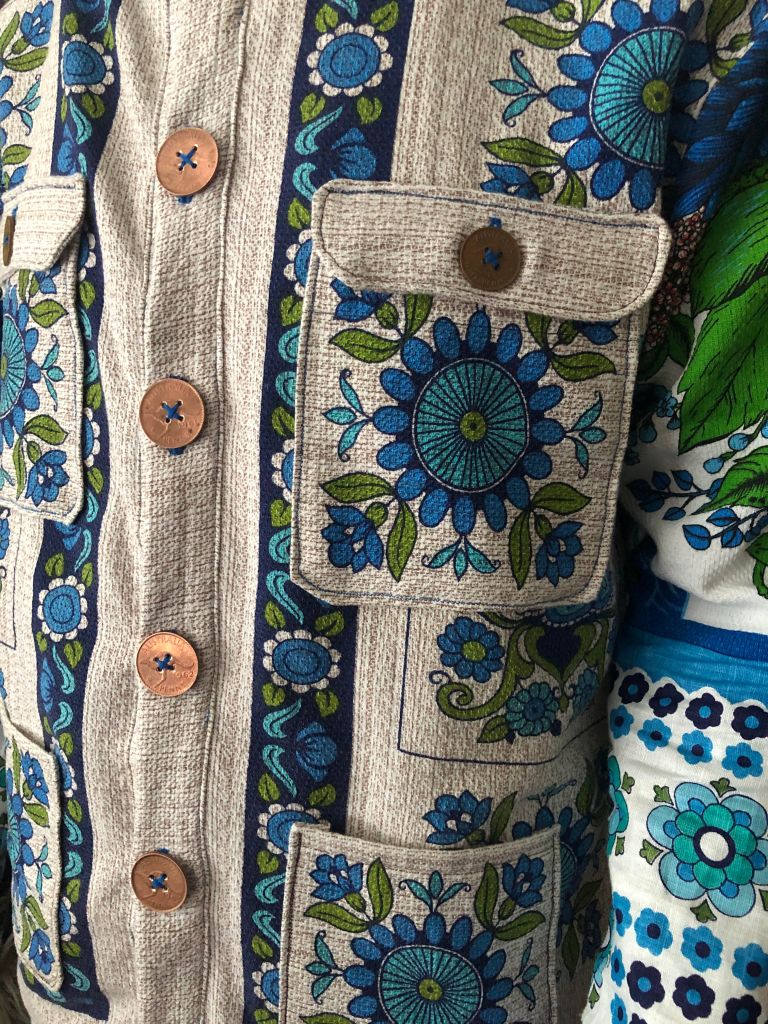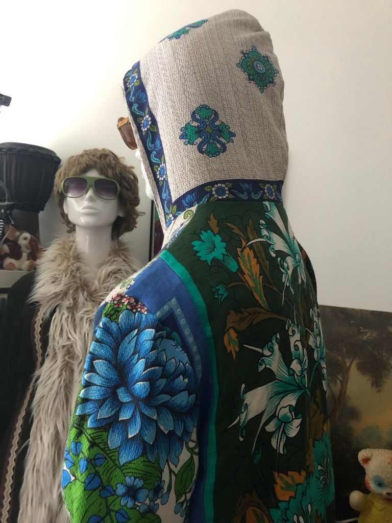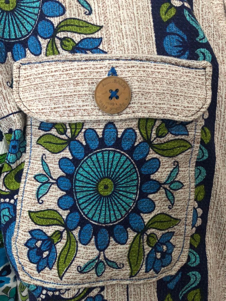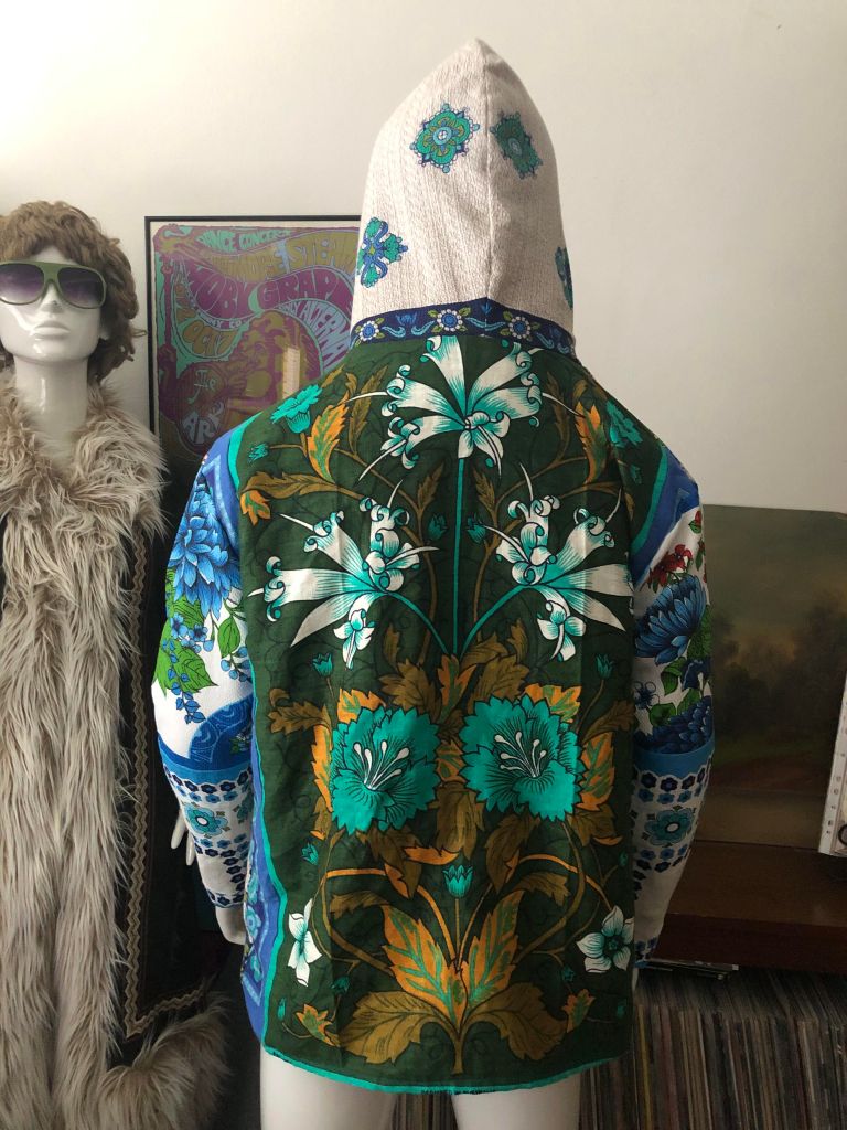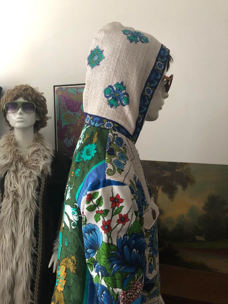 For this one i upcycled a vintage tablecloth for the outer front and hood, vintage tea towels for the arms and back, and a vintage tablecloth for the inner lining. Australian pennies and half pennies were used for the buttons. Debuted at Valor fashion event on the 29th June, 2024 @sobahbeverages (insta), Burleigh Heads, Gold Coast (Australia).