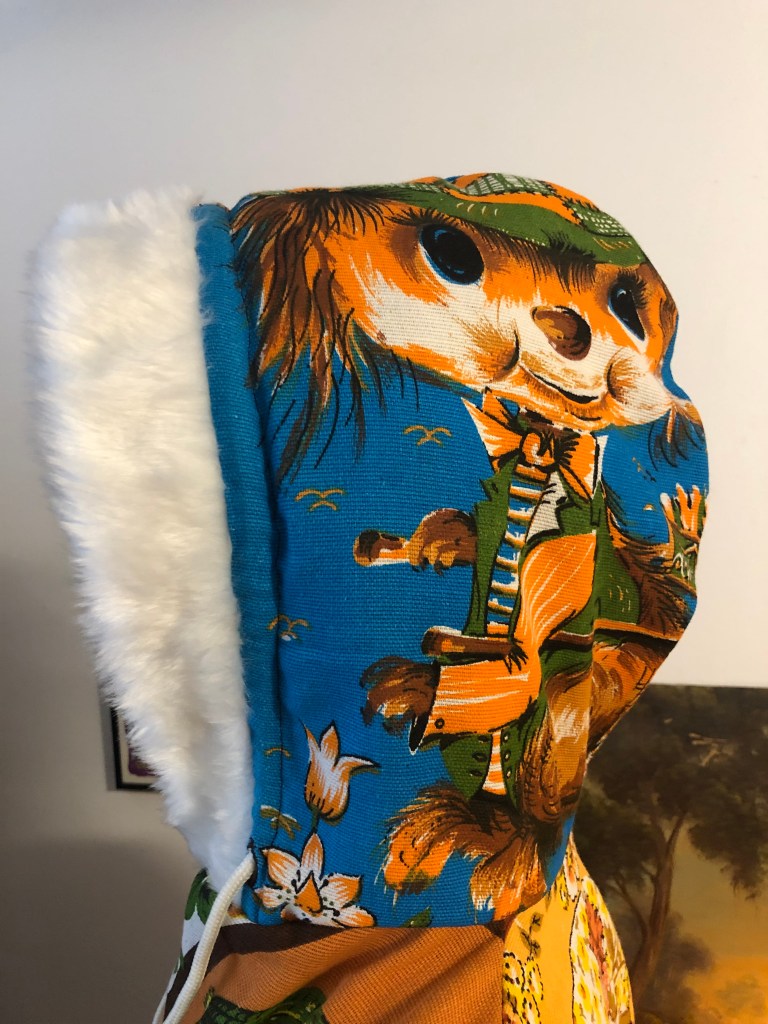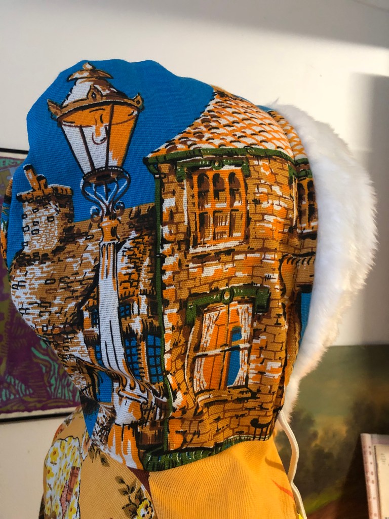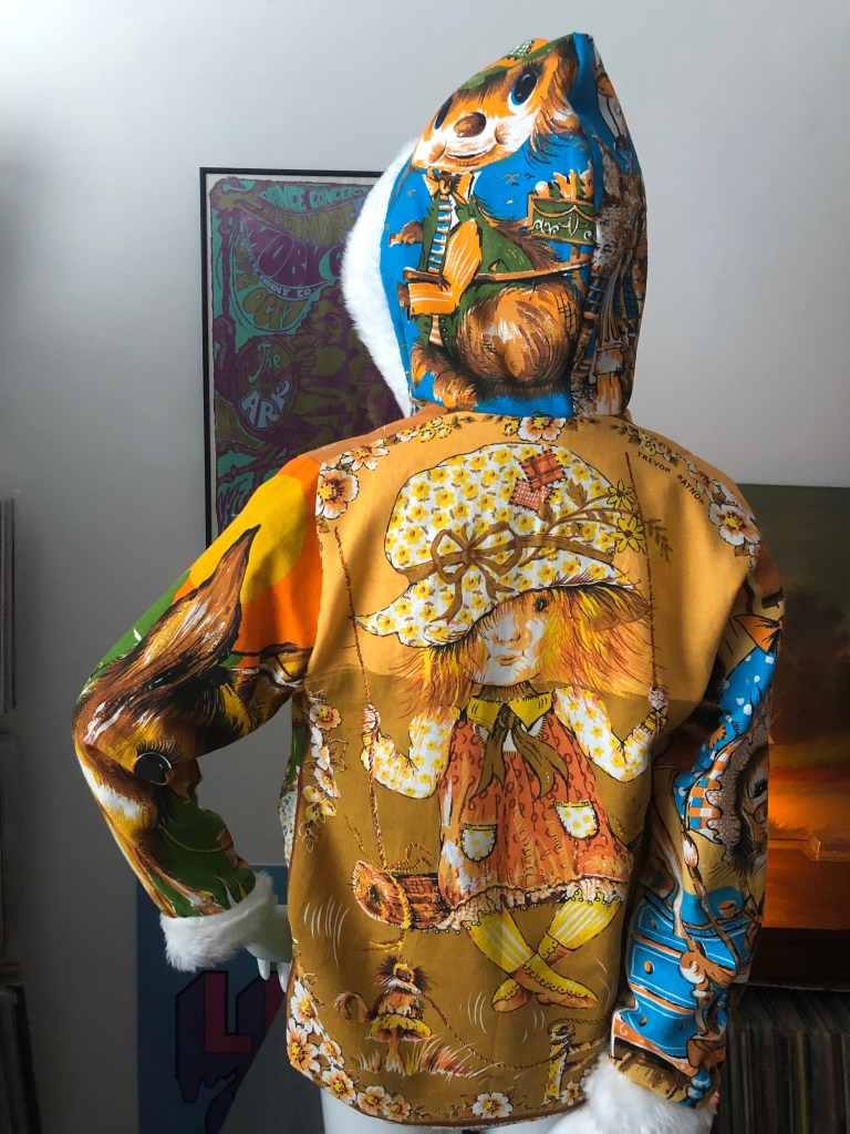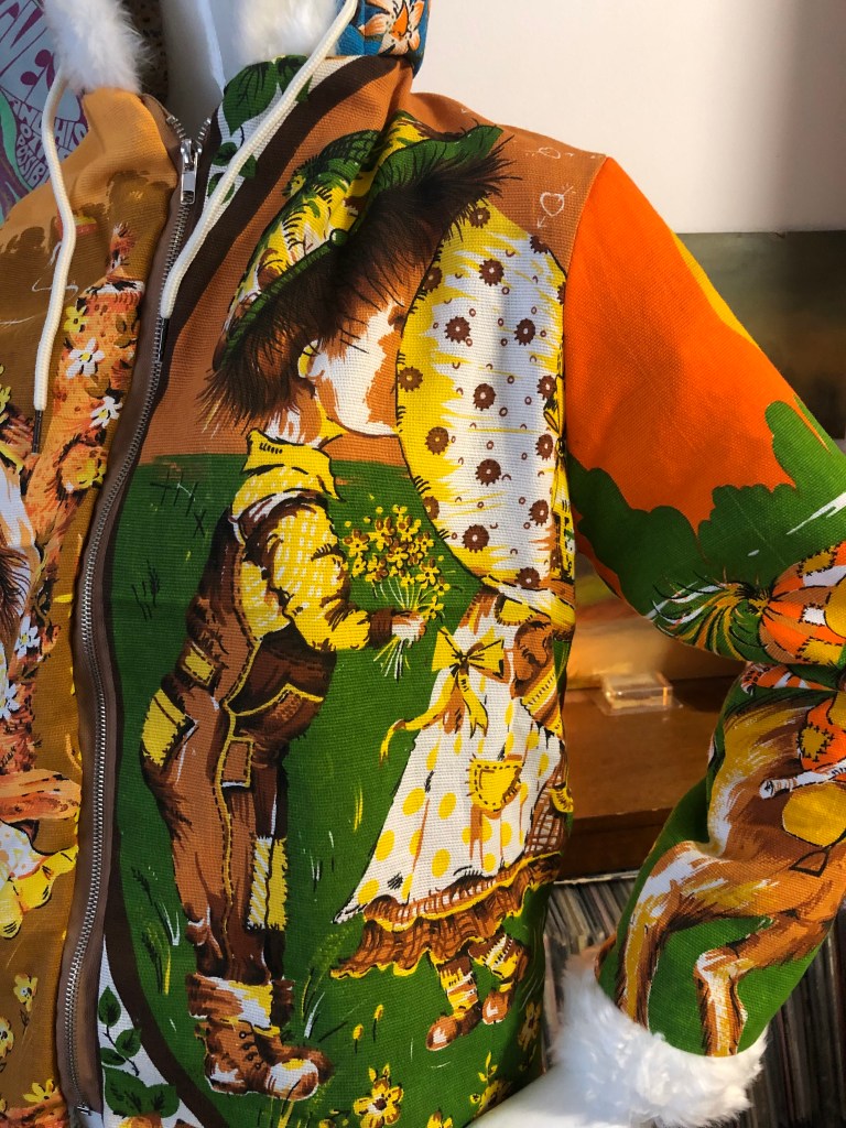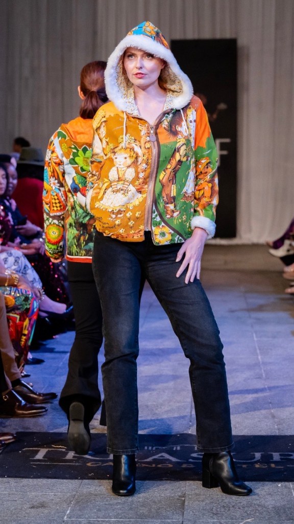 For the exterior of this Hoodie, i used vintage tea towels with designs by artist Trevor Raynor, which seemed to be popular in the 1970’s/80’s. Although, despite extensive searching online, i was unable to find ANY information about Trevor Raynor. But, if anyone out there can help, i’d love to hear from you. Was fun adding white faux fur lining to hood and cuffs for first time with this one, and also having the copper coins on the zippers for this show. Some models also wore the matching copper coin earrings, which looked great.