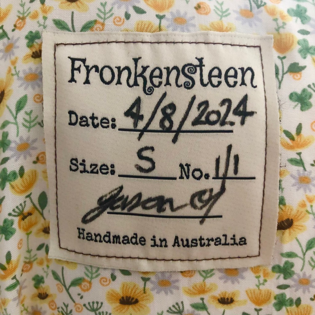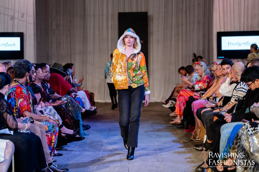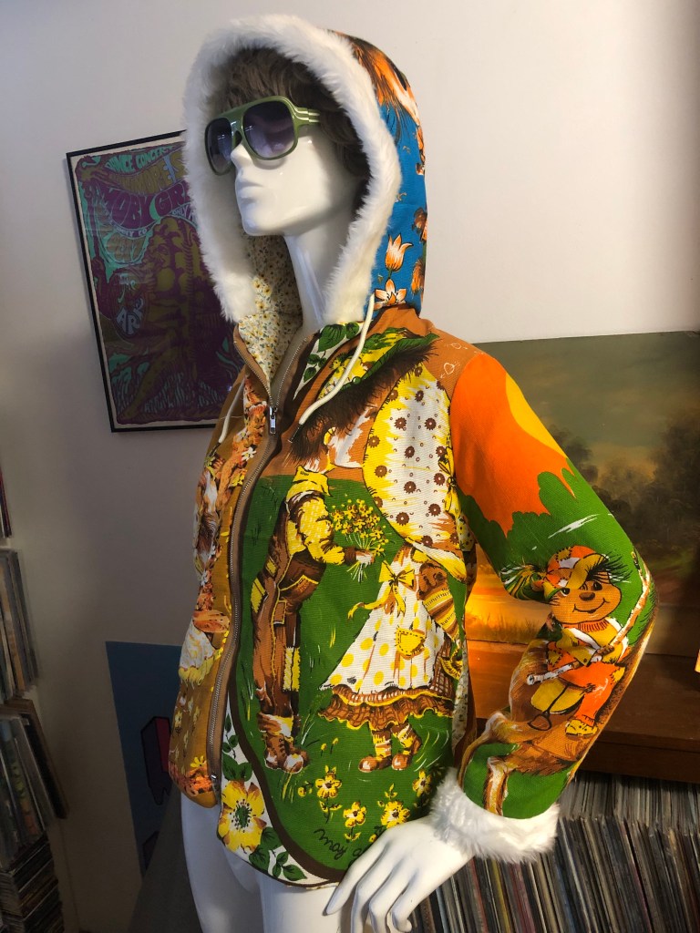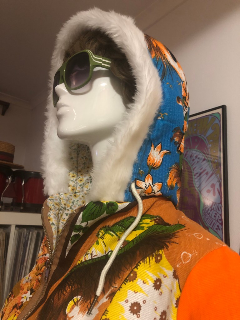 For the exterior of this Hoodie, i used vintage tea towels with designs by artist Trevor Raynor, which seemed to be popular in the 1970’s/80’s. Although, despite extensive searching online, i was unable to find ANY information about Trevor Raynor. But, if anyone out there can help, i’d love to hear from you. Was fun adding white faux fur lining to hood and cuffs for first time with this one, and also having the copper coins on the zippers for this show. Some models also wore the matching copper coin earrings, which looked great.