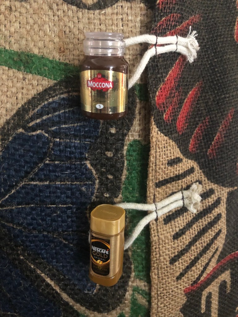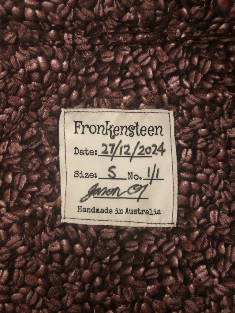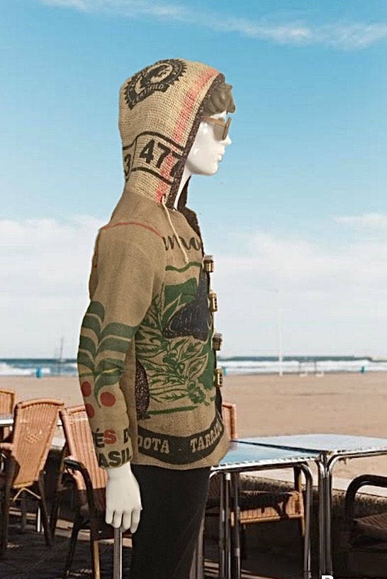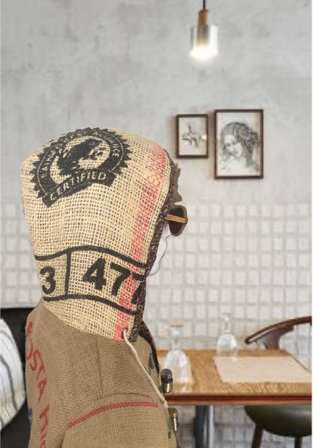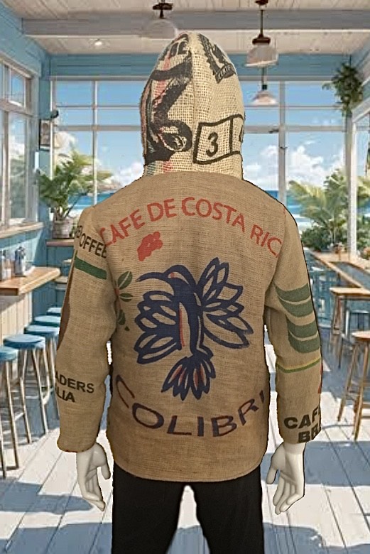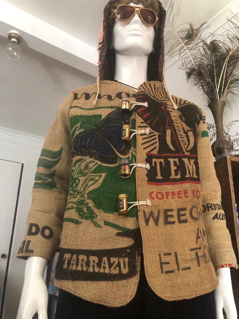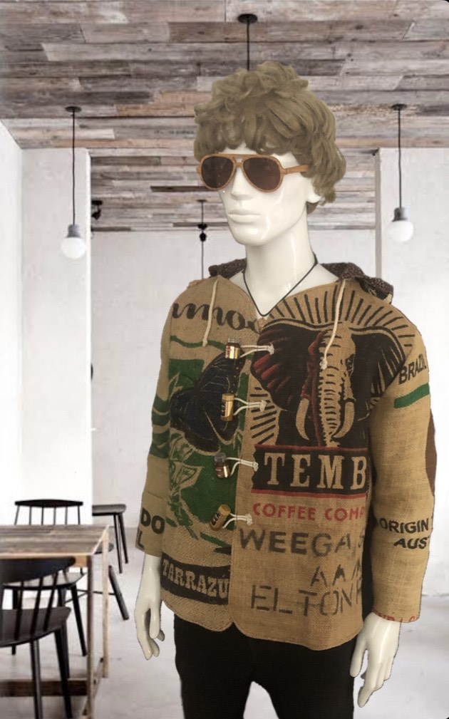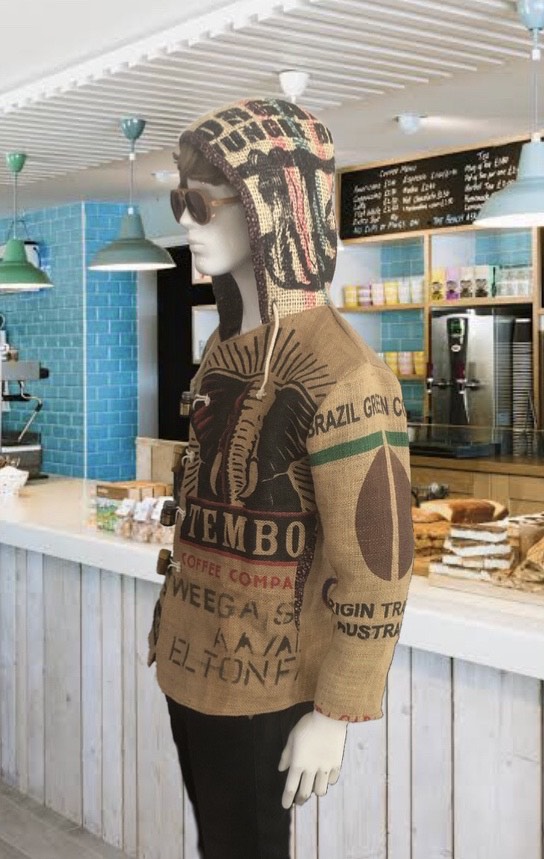 Made from hessian coffee sacks, coffee bean printed inner and various recycled materials.